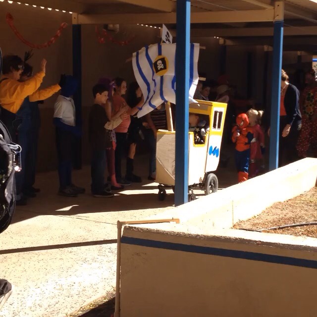 Daddy constructed a ship out of cardboard that fit directly on to the wheelchair. Then Mommy decorated it and constructed the mast out of a sheet of felt and blue streamers.